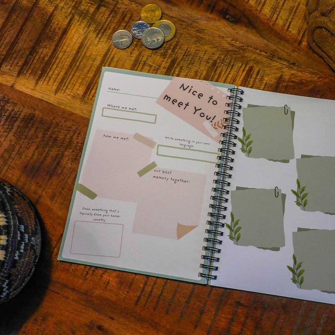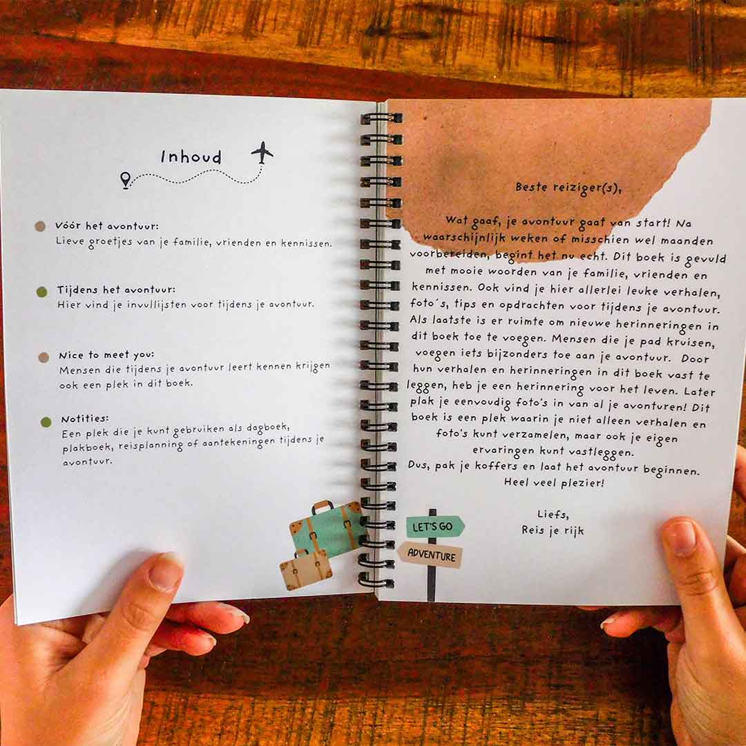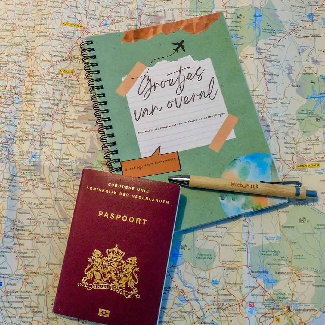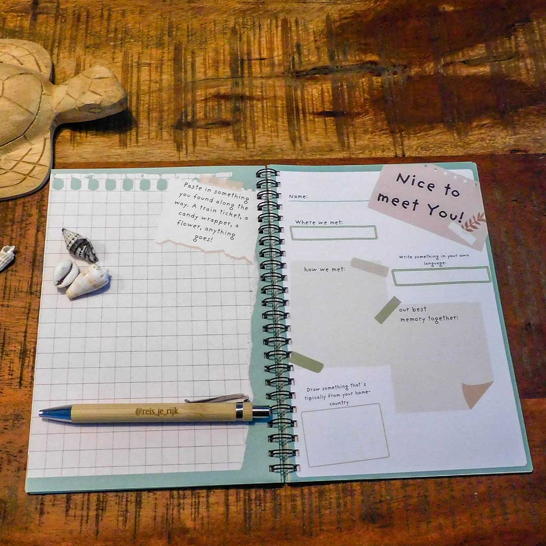 Ook vind je hier invullijsten zoals bijvoorbeeld het inkleuren van de vlaggen van landen waar je mensen van hebt ontmoet. - Onderweg ontmoet je nieuwe mensen die jouw reis rijker maken. Ook zij laten lieve woorden achter, waar je met liefde aan terugdenkt als je weer thuis bent gekomen van je avontuur.