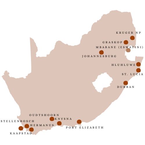 Veel mensen vergissen zich in de grootte van dit land. Tenzij je maanden de tijd hebt, raden wij je aan om keuzes te maken, Hieronder beschrijven wij wat we tof vinden per bestemming en hoeveel nachten wij je zouden aanraden om op een plek te blijven. Onze handige kaart met plaatsnamen, helpt je hopelijk bij het selecteren van een juiste route. Om het iets makkelijker te maken, verdelen we de plekken tussen “Kaapstad” (west) en “Johannesburg” (oost).